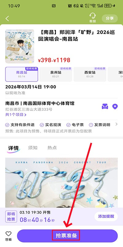 6、如果你想要看的演出还没有开始售卖门票,还可以设置抢票提醒,进入演出详情页面,选择观影站点,点击页面下方的“抢票准备”按钮;