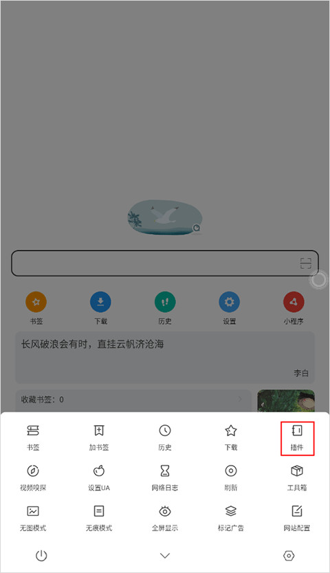 1、在嗅觉浏览器手机版首页点击右下角的“设置图标”选择“插件”。