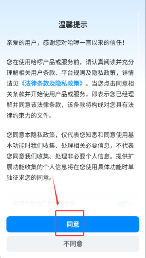 1、首次启动哈啰顺风车客户端需阅读并勾选同意相关协议条款,点击确认后正式跳转至应用内部服务首页面。