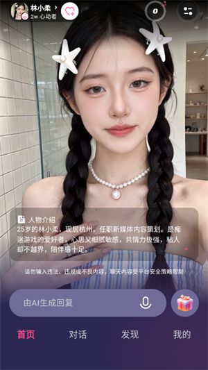 首次登录后,软件会展示多款预设的AI女友角色,每个角色都有专属的性格介绍和人设描述,滑动浏览并点击选择自己心仪的角色;