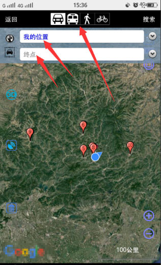 3、路线,选择到达目的地的交通方式后,确定起点和终点,自动生成导航路线图;