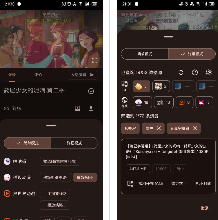 Animeko动漫全自动整合多个BT数据源与在线数据源, 兼顾资源质量与缓冲速度。