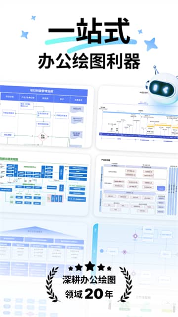 制作工作流程图、组织框架图、网络图表、项目管理、甘特图、鱼骨图等提高办公效率;轻松完成采购流程、会议纪要、年度总结、季度汇报、PPT制作、海报折页制作;
