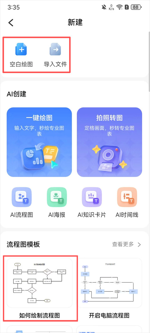 1、打开万兴图示,在首页点击新建,可创建空白绘图或从本地导入文件,也可在下方选择模板应用;
