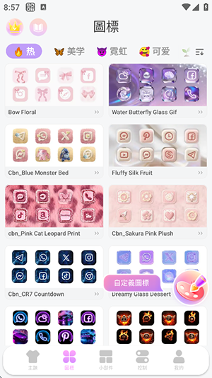 进入“Icons”板块,可选择不同风格的图标包(如Pink Cat Felt、Cute Milktea Bear等),也可点击“Custom Icons”自定义图标。