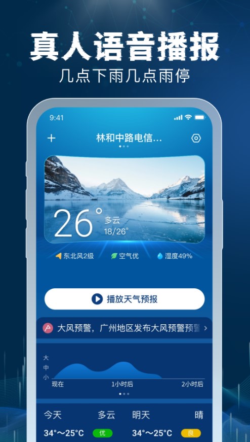 4、忙碌时只需要用小手指轻轻一点,智慧语音播报通过真人播报方式传递天气信息,确保您在任何状况下都不错过每个气象变化。
