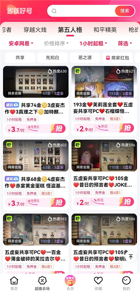 1、打开租号玩专业版app,进入【超值会场】界面,选择【省钱好号】还是【大神靓号】板块。