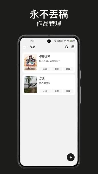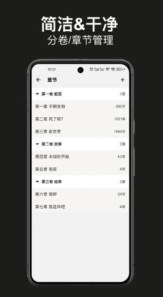 2、【创作】 简洁的页面让你轻松上手创作网文小说,开启沉浸式写作体验。