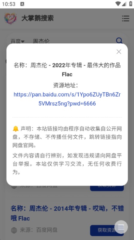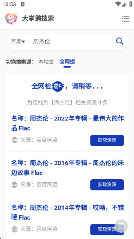 1、全网搜索:大掌鹅搜索支持影视、音乐、资料等多类型资源搜索。