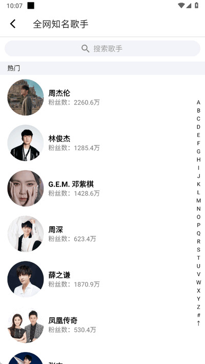2、用户们还可以根据歌手名单来挑选喜欢的歌手的歌曲。
