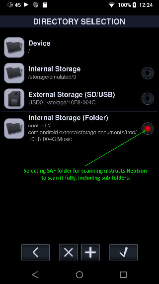 5、这里是外部 SD 中的 /Music 文件夹已添加到 Neutron,您可以选择它进行扫描,也可以点击并浏览其子文件夹并选择它们进行扫描。