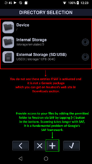 2、如果您在 Android 11+ 上使用 2.19+ 版本,那么您将看不到 Device 或 SD,只能访问 Neutron 的内部文件系统(沙盒)。您可以通过在网络设置中激活内部 FTP 服务器来访问它。点击底部的 [+] 以添加允许 Neutron 访问的文件夹。