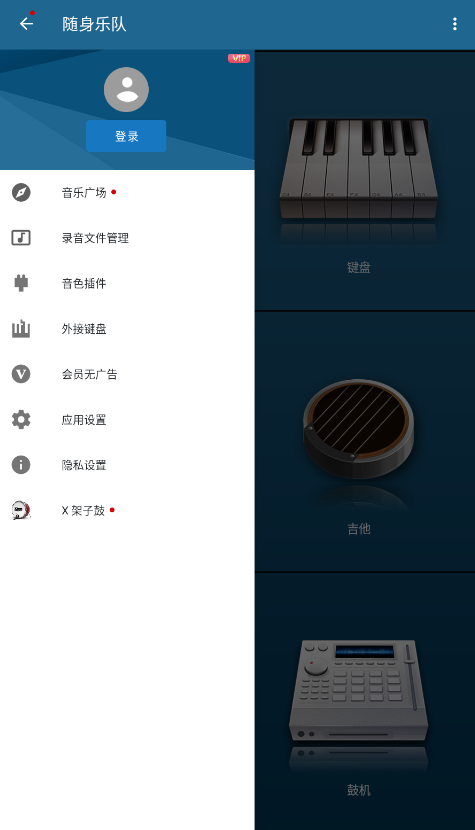 1、用户们在随身乐队里,可以直接通过随身乐队首页的“多音轨合成器”,合成和调整手机里的音频文件,或者使用直接用手机来演奏录制“架子鼓”、“吉他”等乐器。