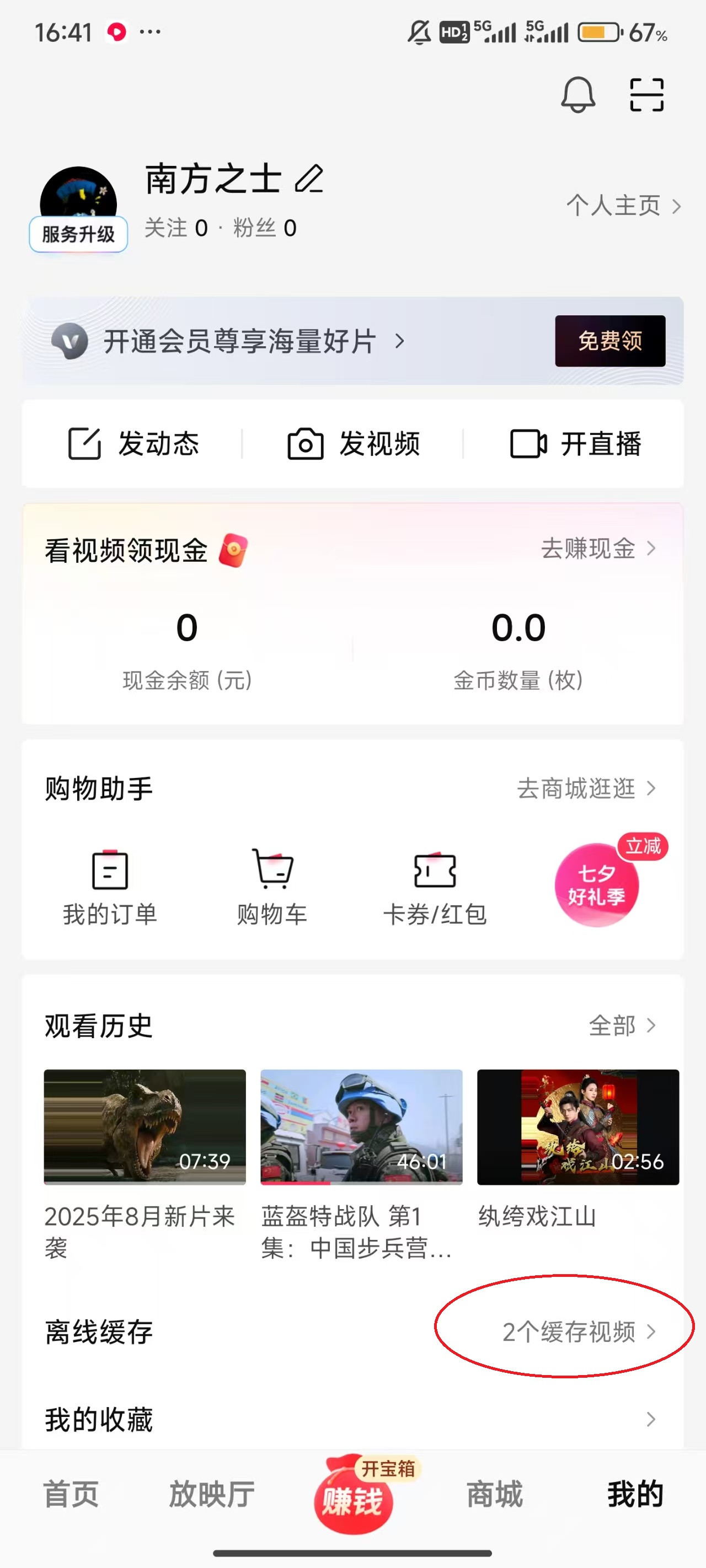 5、回到“我的”页面,点击屏幕下方的“离线缓存”。