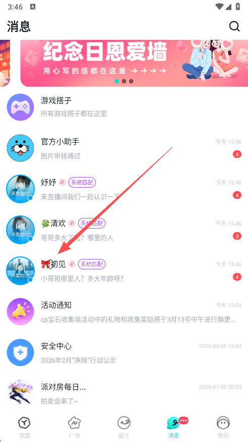1、在本站下载安装进圈app,进入消息页面,找打你要拉黑的对象;