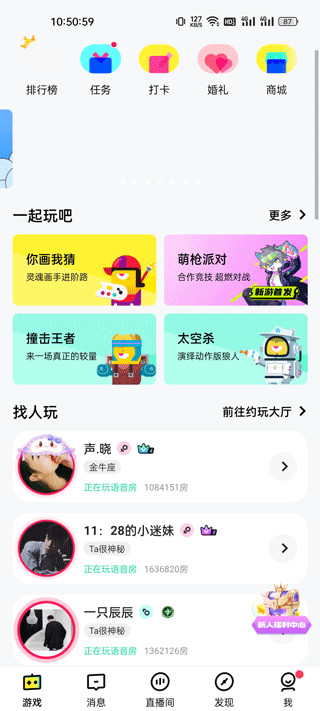 玩吧游戏app官方正版免费是个线上娱乐交友软件,谁是卧底、狼人杀、你画我猜,手机上就能组局。想玩了,开个房间,等几秒,人就满了。玩吧游戏不用等朋友都有空,不用怕凑不齐人。玩吧游戏里聊得来的,可以加好友、接着玩。玩着玩着,就认识了;认识久了,就成了朋友。语音、弹幕、实时互动、角色扮演,都是年轻人习惯的交流方式。