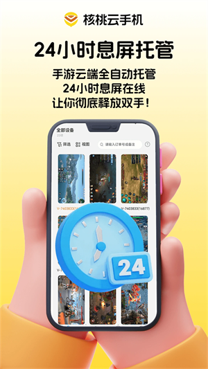 核桃云手机是功能强大的虚拟云端设备应用,为用户提供随时在线的独立云手机环境。通过云端运行机制,用户无需占用本地存储与性能资源,即可实现应用挂机、游戏托管以及多账号同步管理等操作。核桃云手机软件支持灵活配置,能够根据不同需求调整性能参数,保障运行稳定流畅。无论是长时间在线任务还是日常使用,都能轻松应对。核桃云手机便捷的远程连接方式,让用户随时随地接入云端设备。