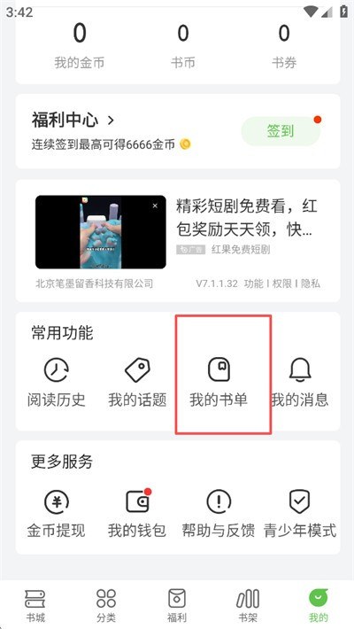 2、下滑界面在"常用功能"区域,找到并点击 "我的书单";