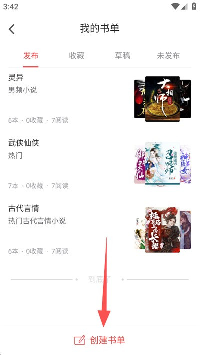 3、进入"我的书单"后,点击底部 "创建书单" 按钮;