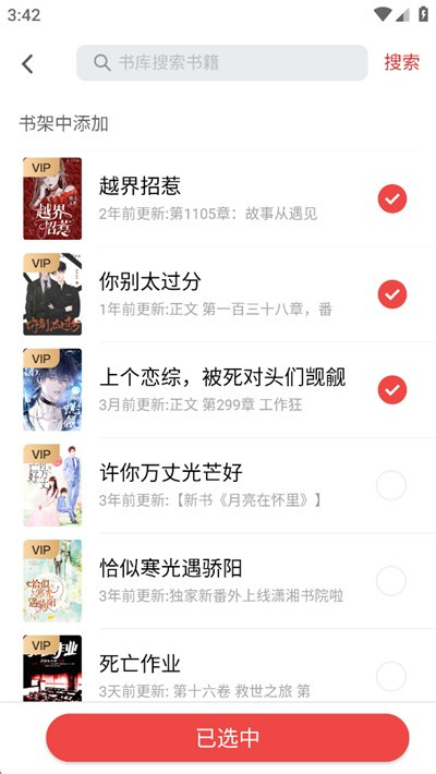 5、可从"书架中添加"选择已读 / 收藏小说,或通过搜索框查找目标书籍,勾选要加入书单的小说后,点击 「已选中」 完成添加,确认信息后,点击右上角 "发布",完成书单创建;