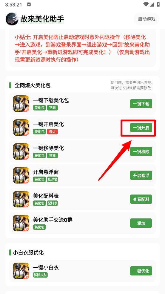 3、完成后向下滑动选择美化包,点击"一键开启"。