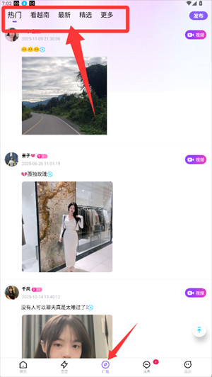 2、进入广场页面,使用热门及越南等标签筛选感兴趣内容。