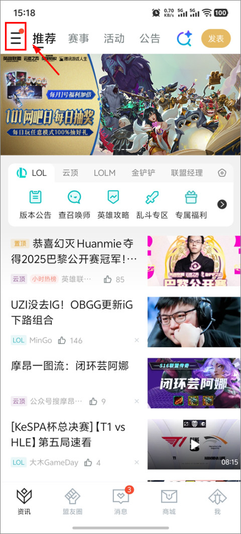 1、进入掌上英雄联盟小程序后,点击左上角“三”;
