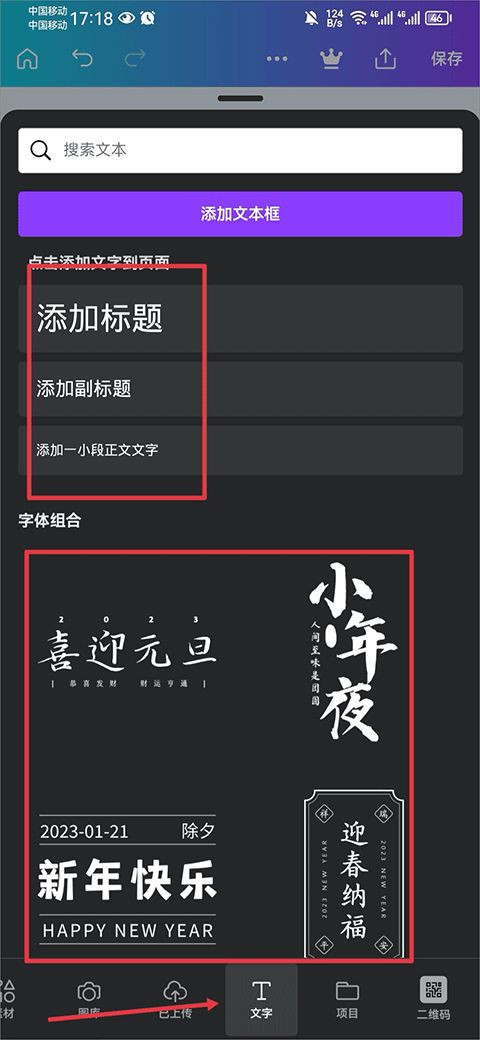 2、打开后,在文字界面中选择并点击文字。