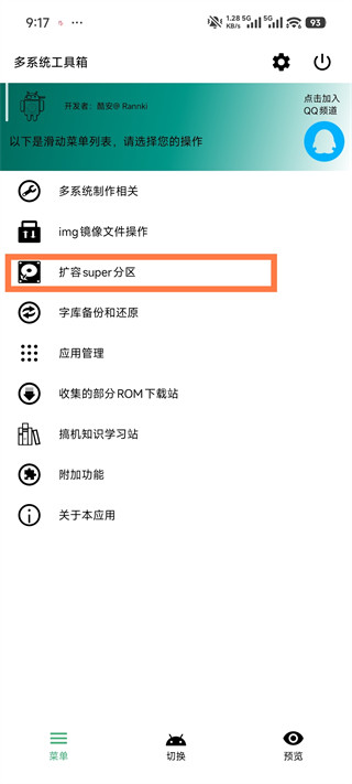 注意:需要root1、打开多系统工具箱App,点击菜单选择【扩容super分区】