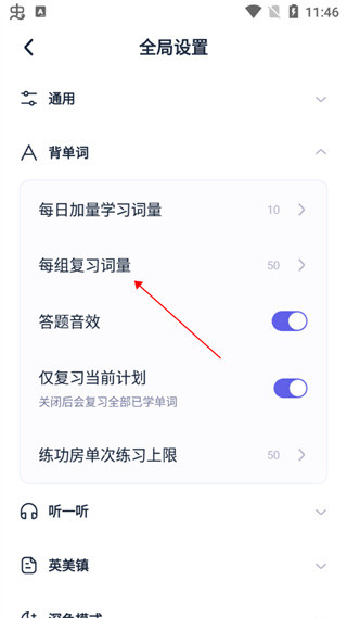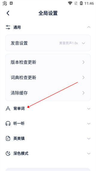 3、进入全局设置页面,点击背单词右边的题型设置;