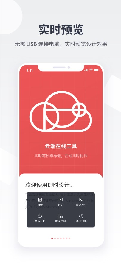 4、实时预览UI 设计文件,真机模拟交互效果,随时随地发布评论。