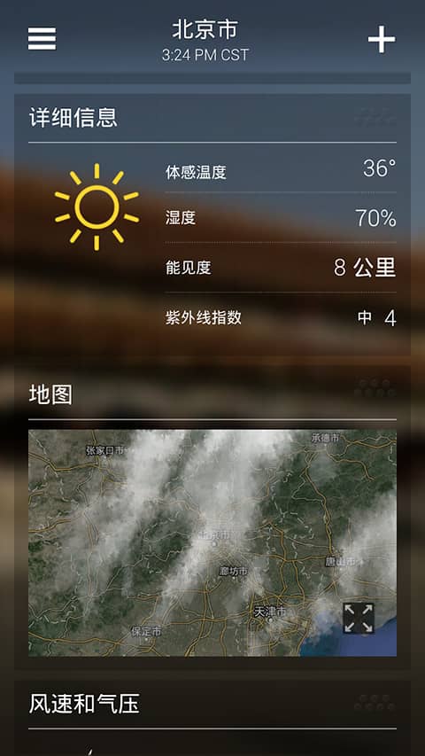 3、数据详情,风速、气压、降水啥都能查,还带动画日出日落。