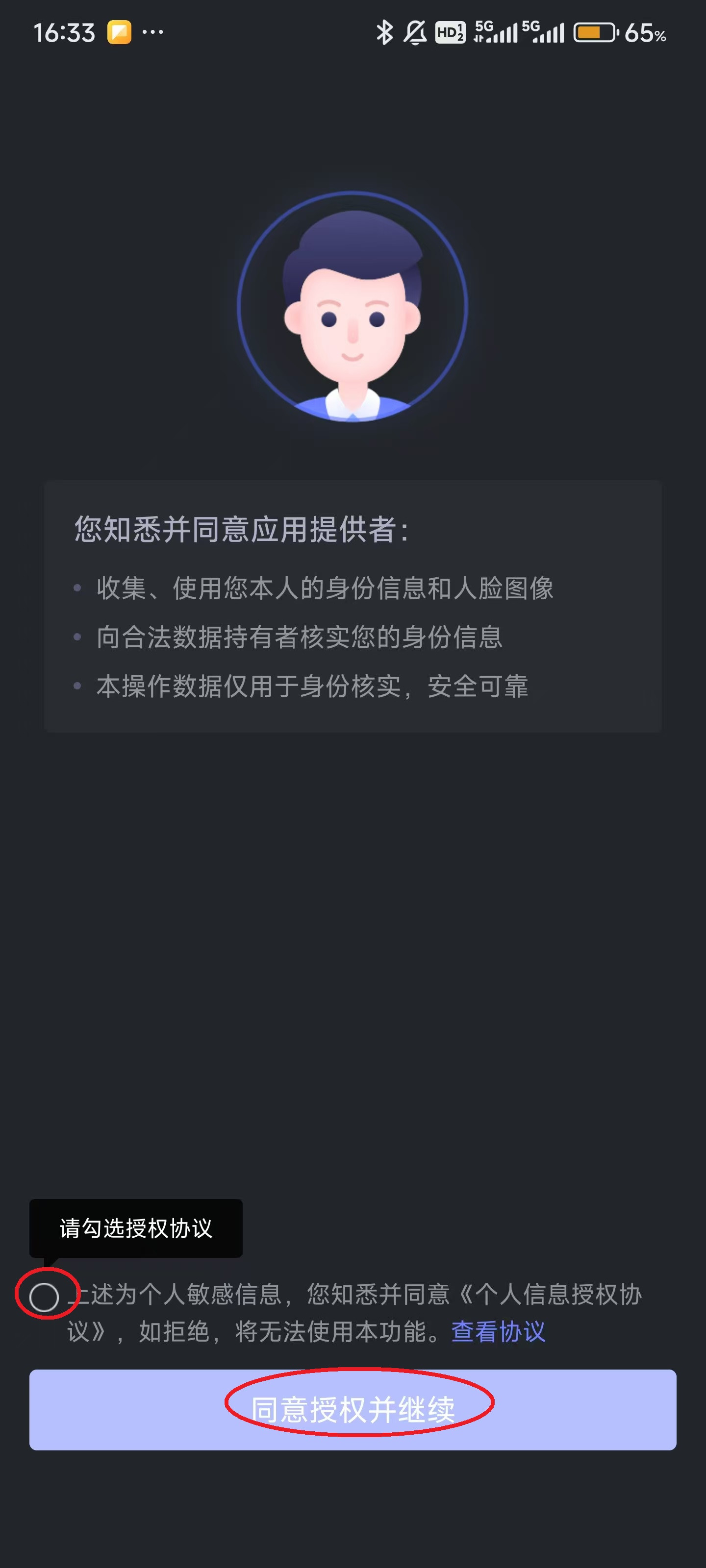 8、点击屏幕左下角的“上述为个人...”,随后点击屏幕最下方的“同意授权并继续”。