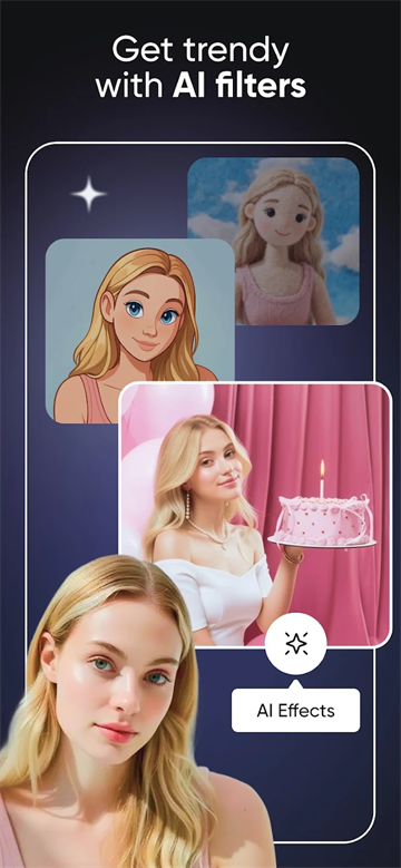 Picsart可制作专业拼贴画、设计和添加贴纸、更换背景和快速移动,一键编辑比如黄金时刻、镜中自拍、复古噪点滤镜或千禧滤镜等。
