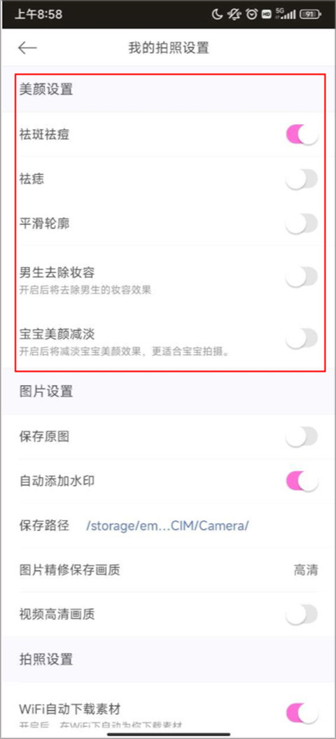 3、找到美颜设置,选择你需要的美颜效果点击打开即可。