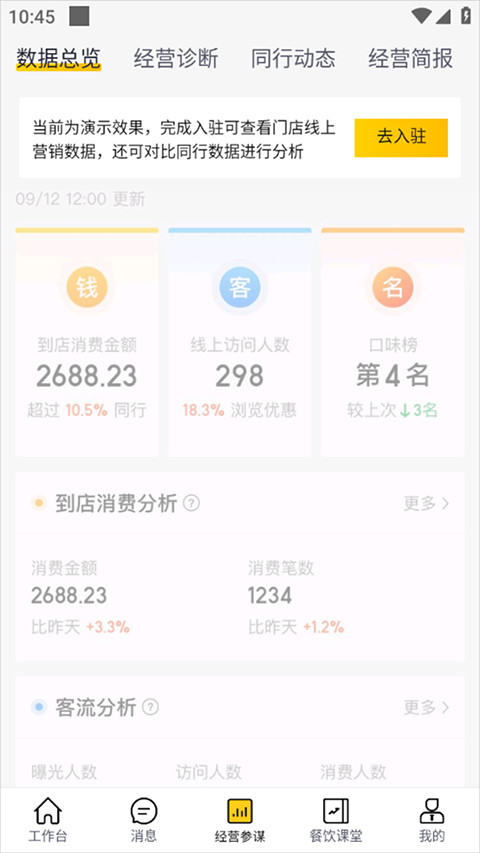 4、美团开店宝可以查看数据总览,经营诊断以及同行动态信息,将根据这些数据帮你经营参谋。