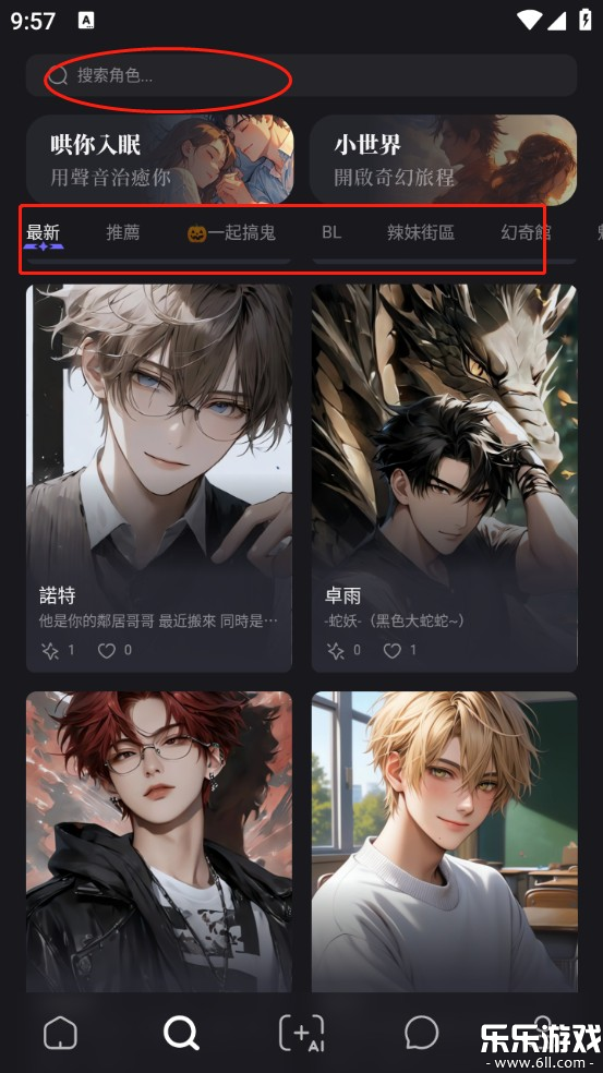 2、点击最下方的搜索界面,可以通过搜索或分类等方式,找到并点击你喜欢的AI角色