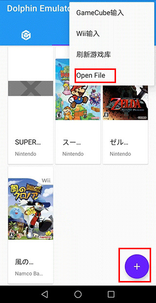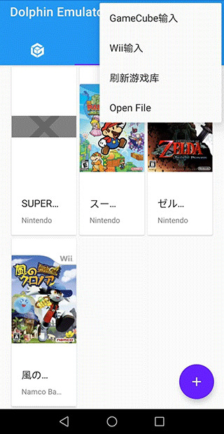加载游戏的方式有两种,一种是右上角更多-Open File打开游戏Rom