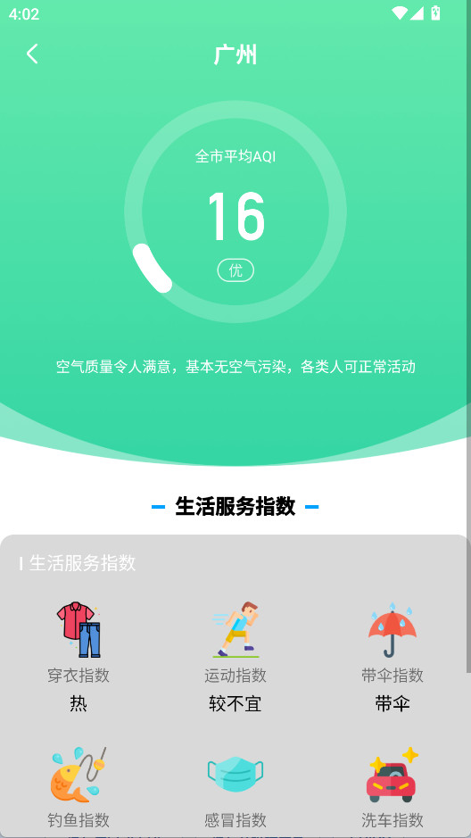 2、点击空气质量查看全市平均AQI和生活指数。