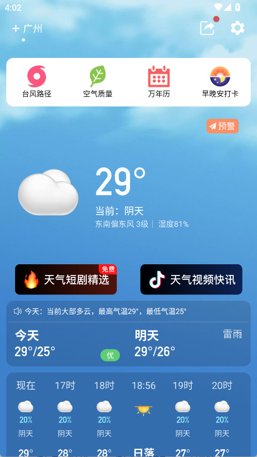 实时监测阴晴雨雪,实现分钟级、公里级预报,同步提供未来48小时逐小时天气。