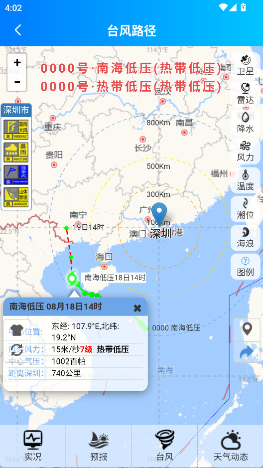 3、点击台风路径能查看风力、雷达等信息。
