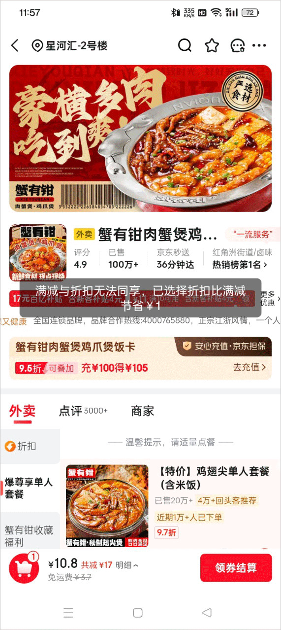 1、点击京东外卖手机版,进入一家你想吃的店铺,可以在首页查看该店铺是否可以堂食、预订以及优惠。