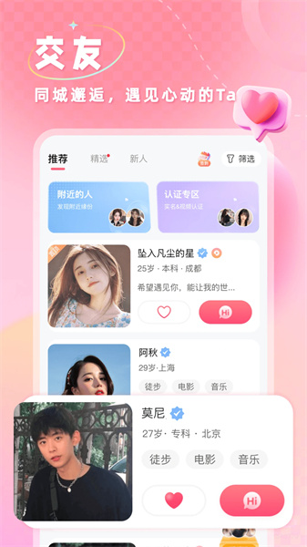 2、【脱单神器】定时推荐附近、同城在线寻爱的单身与您聊天交友,助您觅得真爱,找到合适自己的有缘人,让生活不在孤单寂寞;