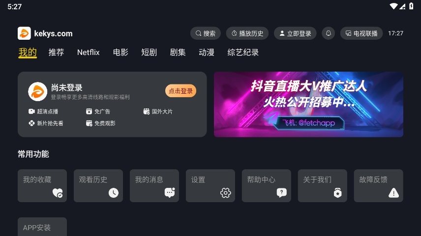 可可影视电视版之后,进入首页,可以看到我的、推荐、netflix、电影、短剧、剧集、动漫、综艺多个栏目;