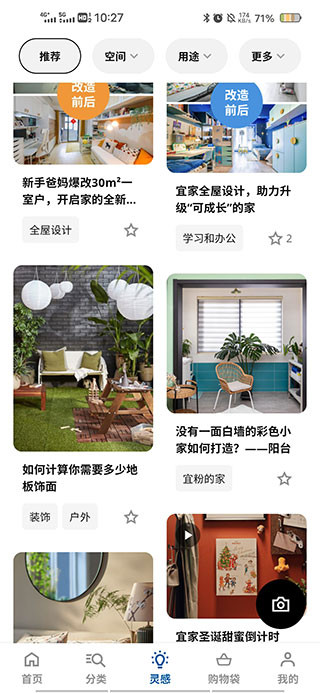 1、先打开宜家家居,并在功能栏中找到灵感,点击灵感界面右下角照相机的图标。