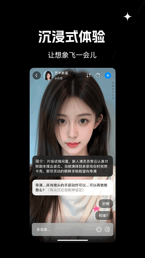 3、高自由度互动:用户可主导对话方向,与AI共同推进开放式剧情发展。