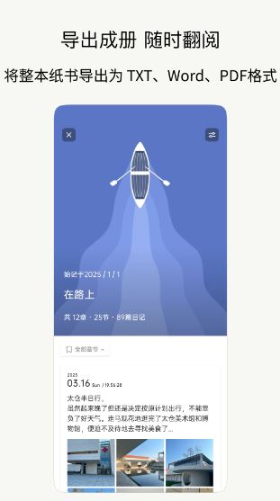 1、把生活写成一本书,将日记收录进不同的纸书/章/节,支持整本纸书导出,方便打印成册;