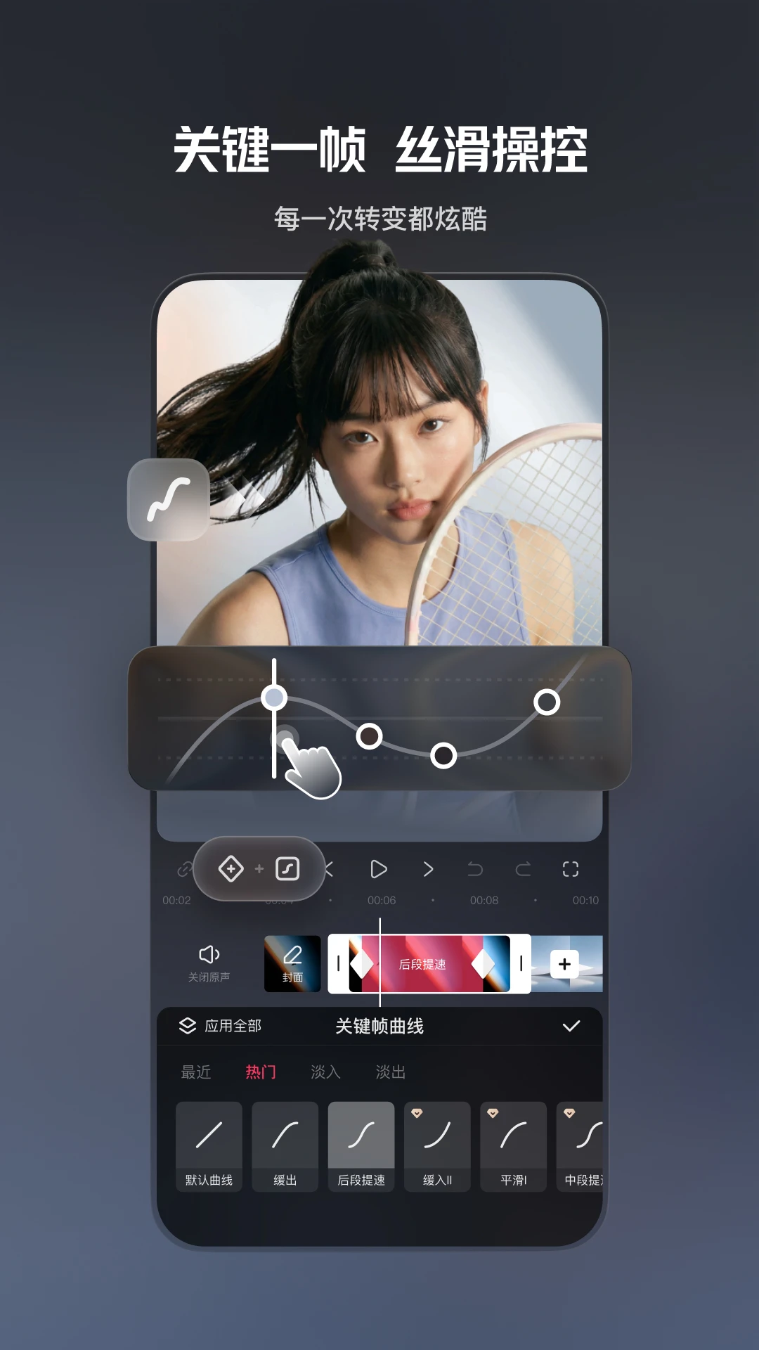 1、多种视频剪辑功能,包括视频分割、裁剪、拼接、倒放、添加常规/曲线/自定义变速、转场、添加封面和片尾等,帮助用户快速完成视频剪辑。