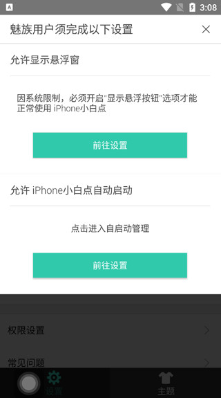 1、下载好小白点虚拟按键软件后,直接打开,软件会有自动提示和设置悬浮窗,点击前往设置即可