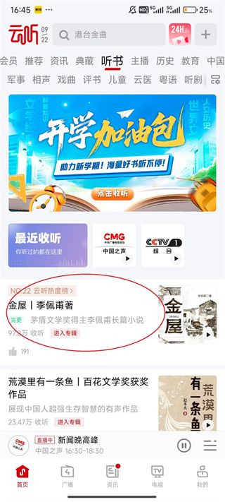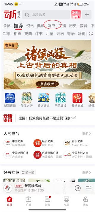 1、点击云听屏幕上方的“听书”。